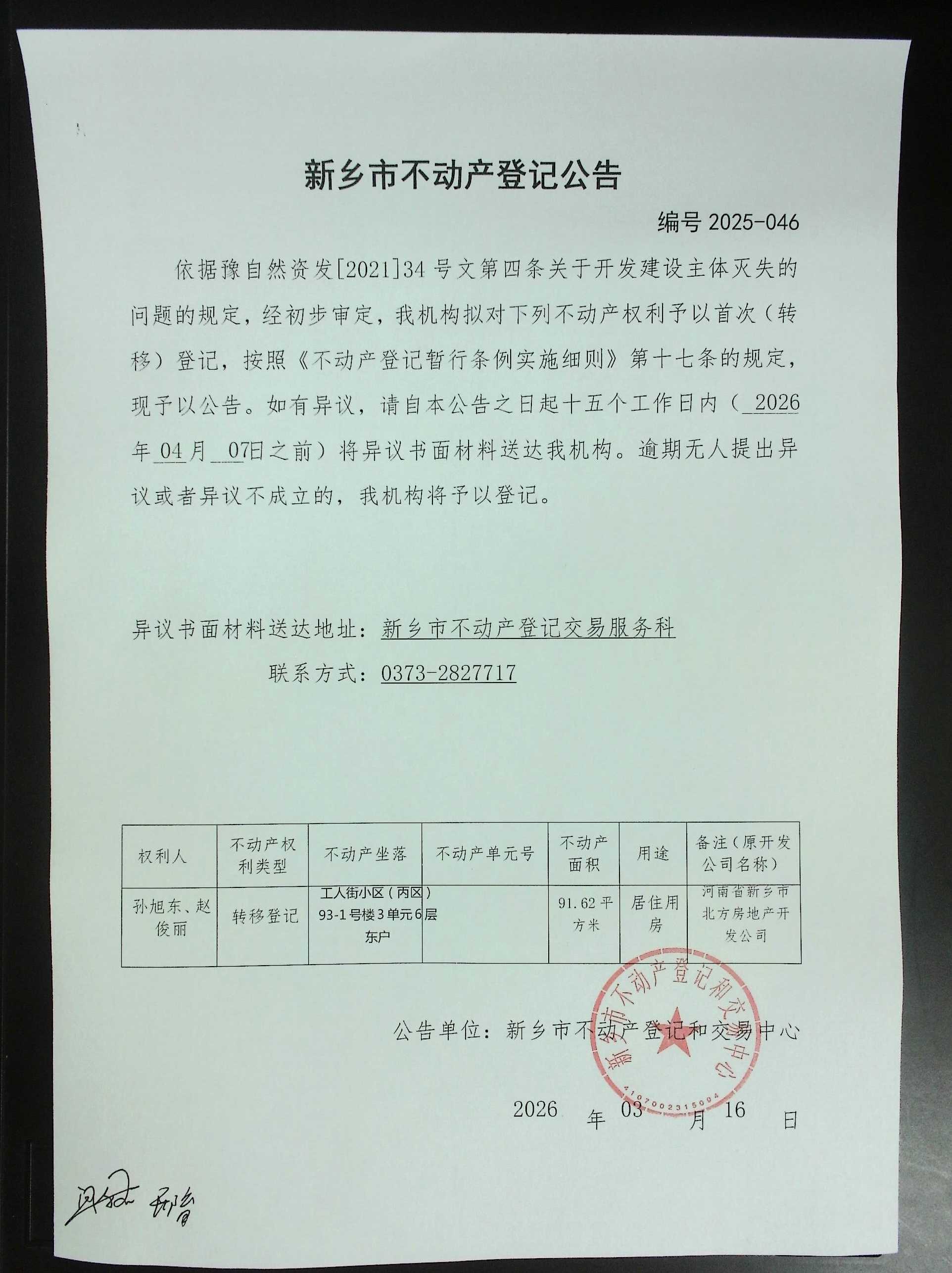 新乡市不动产登记公告(2025-046)